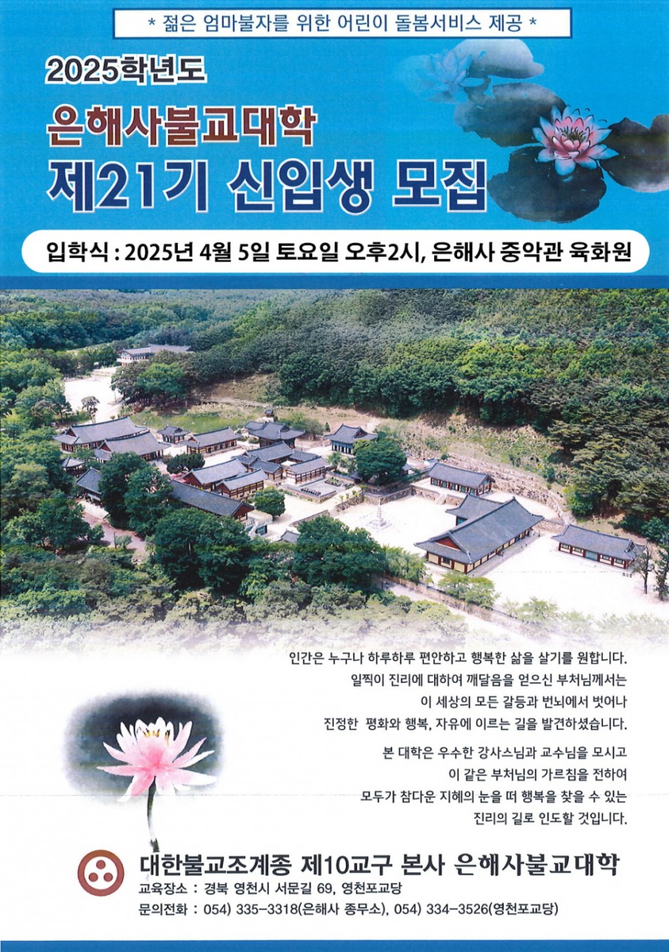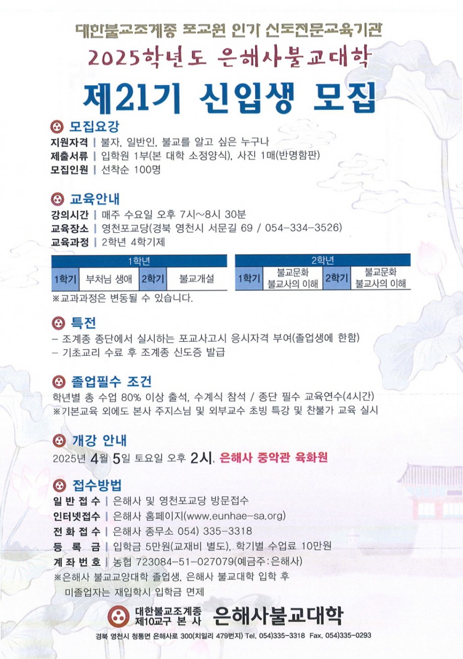 2025학년도 은해사불교대학 제21기 신입생 모집 안내